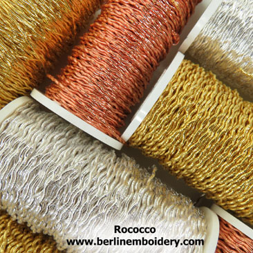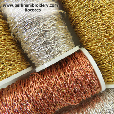 Rococco is couched down singularly or two strands at a time as a filling or outline.