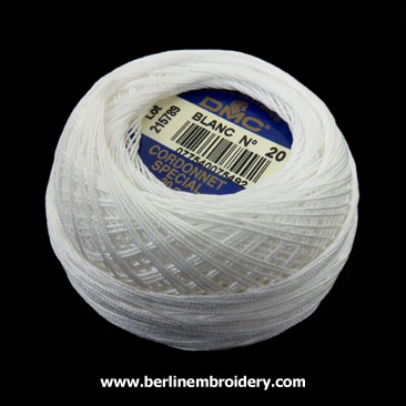 The white DMC Cordonnet No. 20, 100% cotton thread is used for the cord for Carrickmacross Lace embroidery. There are approximately 124 yards (114 meters) on the 20 gram ball.