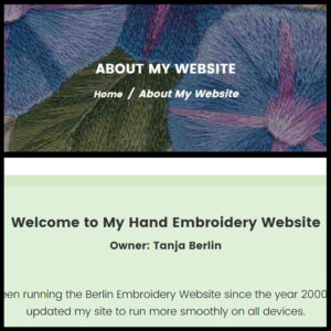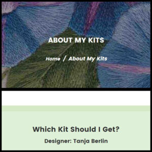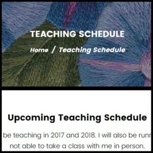 About My Website About My Kits Biography Blog Contact Me Discounts Embroidery Frames Information Embroidery Tips Frequently Asked Questions Free Designs Free On-Going Critique Gallery Gift Certificates Information PDF Files Mounting Embroideries Needle Painting Information New Products Metal Thread Information Sale Products Teaching Schedule Online Classes