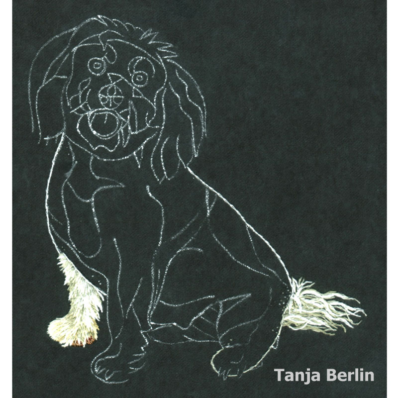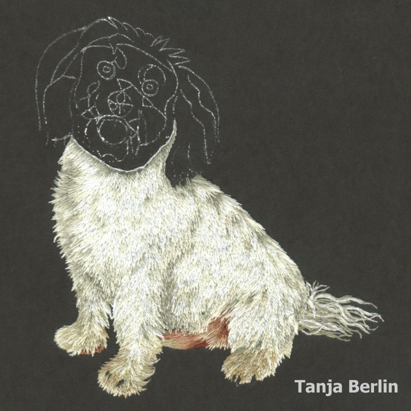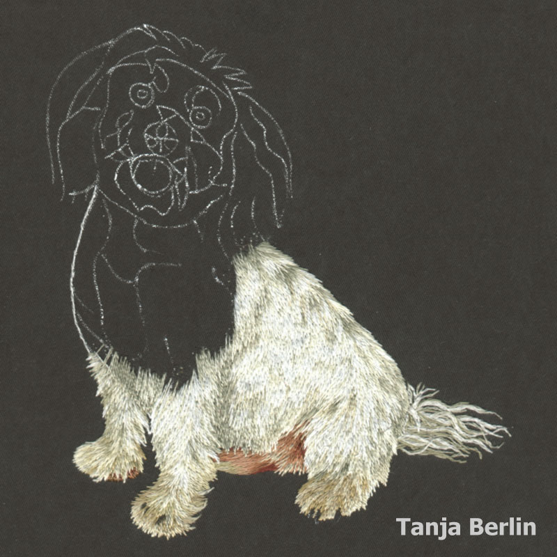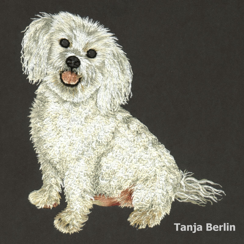 Tiko is a Shih Tzu Bichon dog worked in the method of needle painting which is the blending of straight long and short stitches using different shades of DMC embroidery cotton (floss).